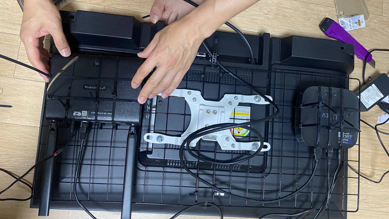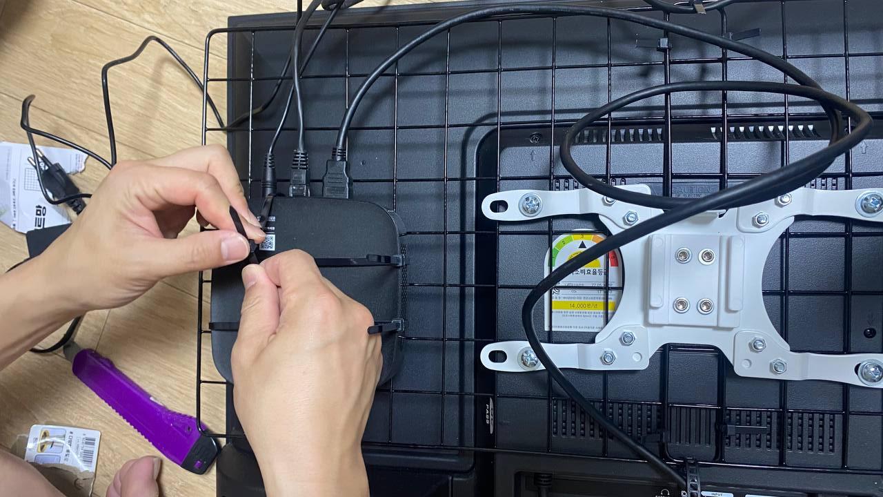 셋톱박스와 기기를 고정시킨 후에는 선들을 설치하고 적절히 정리해서 고정시켜 줍니다. 선들은 너무 타이트하게 정리하는 것보다는 약간의 여유를 두고 돌돌말아 정리해주는 것이 좋습니다. 선 역시 케이블 타이를 활용해 격자 네트망에 고정시켜 줍니다. 어댑터도 역시 케이블 타이를 활용해 고정시킵니다.