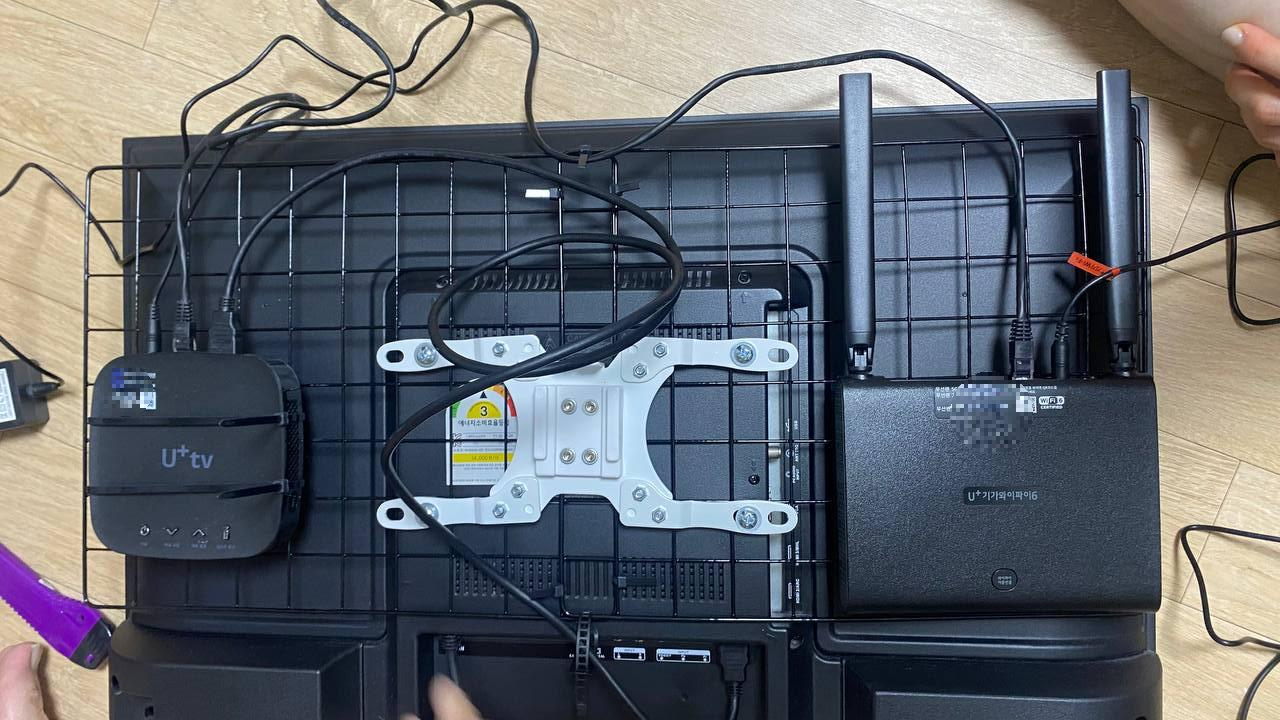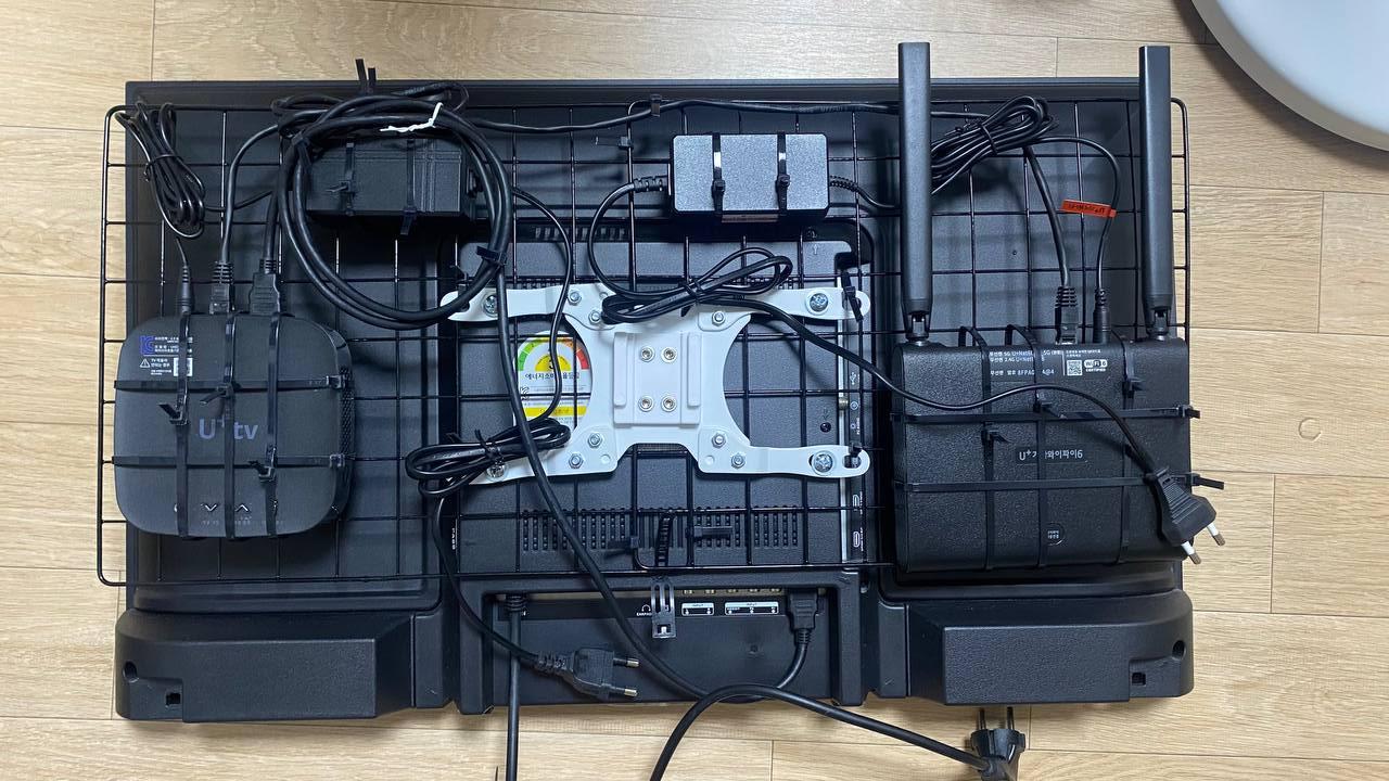 아래와 같이 TV 거치대와 TV 사이에 네트망을 올려 놓고 거치대를 고정하는 볼트, 너트로 네트망을 고정시킵니다. 케이블 타이로 중간 중간 추가적으로 고정시켜 주는 것도 좋습니다. 그 다음 셋톱 박스와 와이파이 공유기를 적절하게 배치해 봅니다. 케이블 타이로 고정하기 전에 적절한 위치를 이리저리 잡아보시는 것을 추천합니다. 적절한 위치를 정하면 케이블 타이를 활용해 고정시킵니다. 기기들이 떨어지지 않도록 케이블 타이를 여러개 사용해 고정시키는 것이 좋습니다.