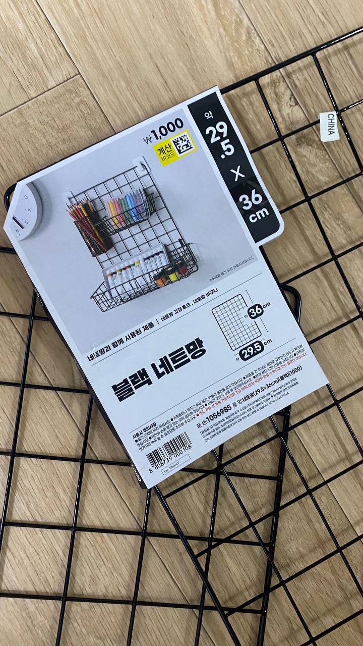 준비물은 매우 간단합니다. 다이소에 가셔서 각자 TV 사이즈에 맞는 격자무늬 네트망과 케이블 타이만 구입하시면 됩니다. TV 사이즈보다는 작게 네트망을 설치하셔야 앞에서 봤을 때 깔끔하게 정리하실 수 있습니다. 저는 위 사진처럼 네트망을 2개 구입했습니다.